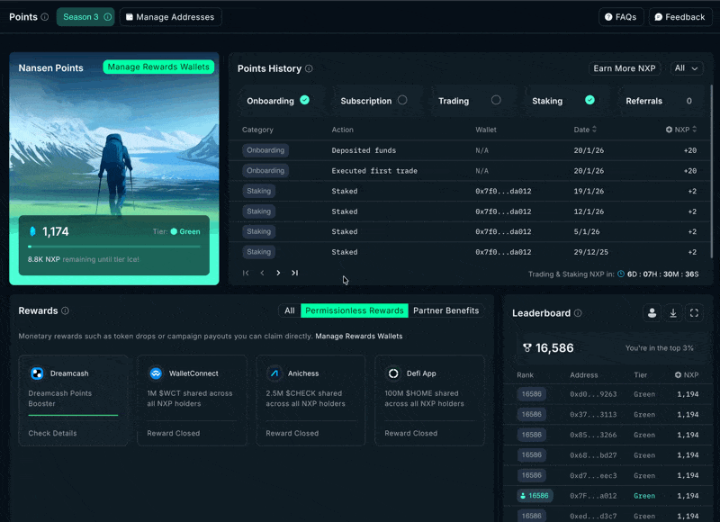 Nansen Points features four ascending tiers: Green, Ice, North, and Star. Each tier you conquer unlocks more tools, enhanced perks, and premium rewards.