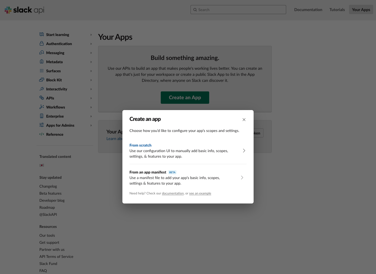 Decide whether you want to start from scratch or use a manifest file to add your app’s basic info, scopes, settings & features - if you don’t know what this is, use From scratch.