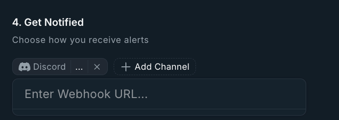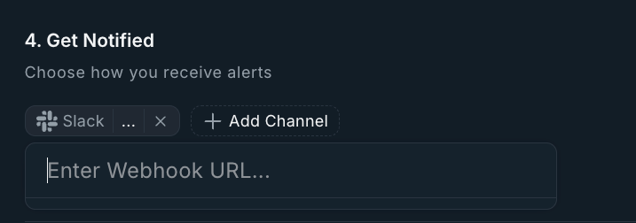 Add a webhook Name, select to which Channel the alerts should be sent, Save the webhook and click the Copy Webhook URL button
